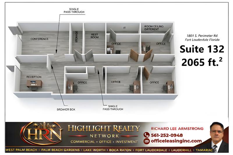 This 2065 SF Suite 132 Professional Medical and Office Space is at 1801 S Perimeter Rd, Fort Lauderdale, FL 33309. This workplace is ideal for shared office spaces, offering ample space to keep you comfortable while you work. Contact us today to schedule a viewing! We are committed to providing exceptional service to our tenants and maintaining a safe and enjoyable working environment. If you have any questions or would like to schedule a building tour, please contact us at [561-468-5907] or [Highlightrealtynetworkrla@gmail.com]. We are excited to hear from you and may welcome you as a new tenant in our building. Thank you for considering us as your new home in Fort Lauderdale, FL.