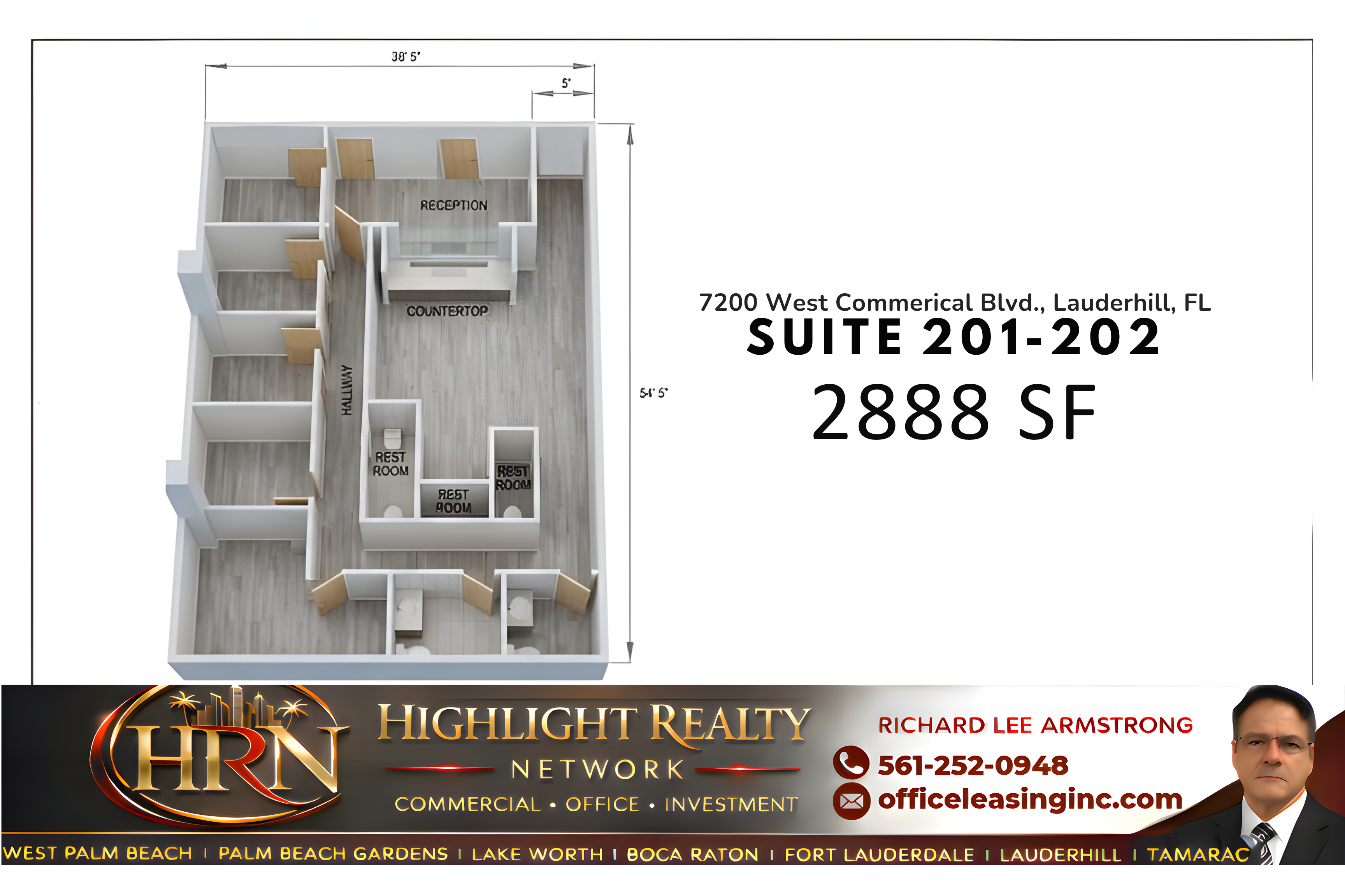 We have 2888 SF Suite 201-202 at 7200 West Commercial Blvd, Lauderhill, FL 33319, with 3 Free months of rent. Come and Visit our Office Space. We are committed to providing exceptional service to our tenants and maintaining a safe and enjoyable working environment. If you have questions or want to schedule a building tour, please contact us at [561-252-0948] or [Highlightrealtynetworkrla@gmail.com]. We are excited to hear from you and look forward to welcoming you as a new tenant in our building. Thank you for considering us as your new home in Lauderhill, FL 33319.