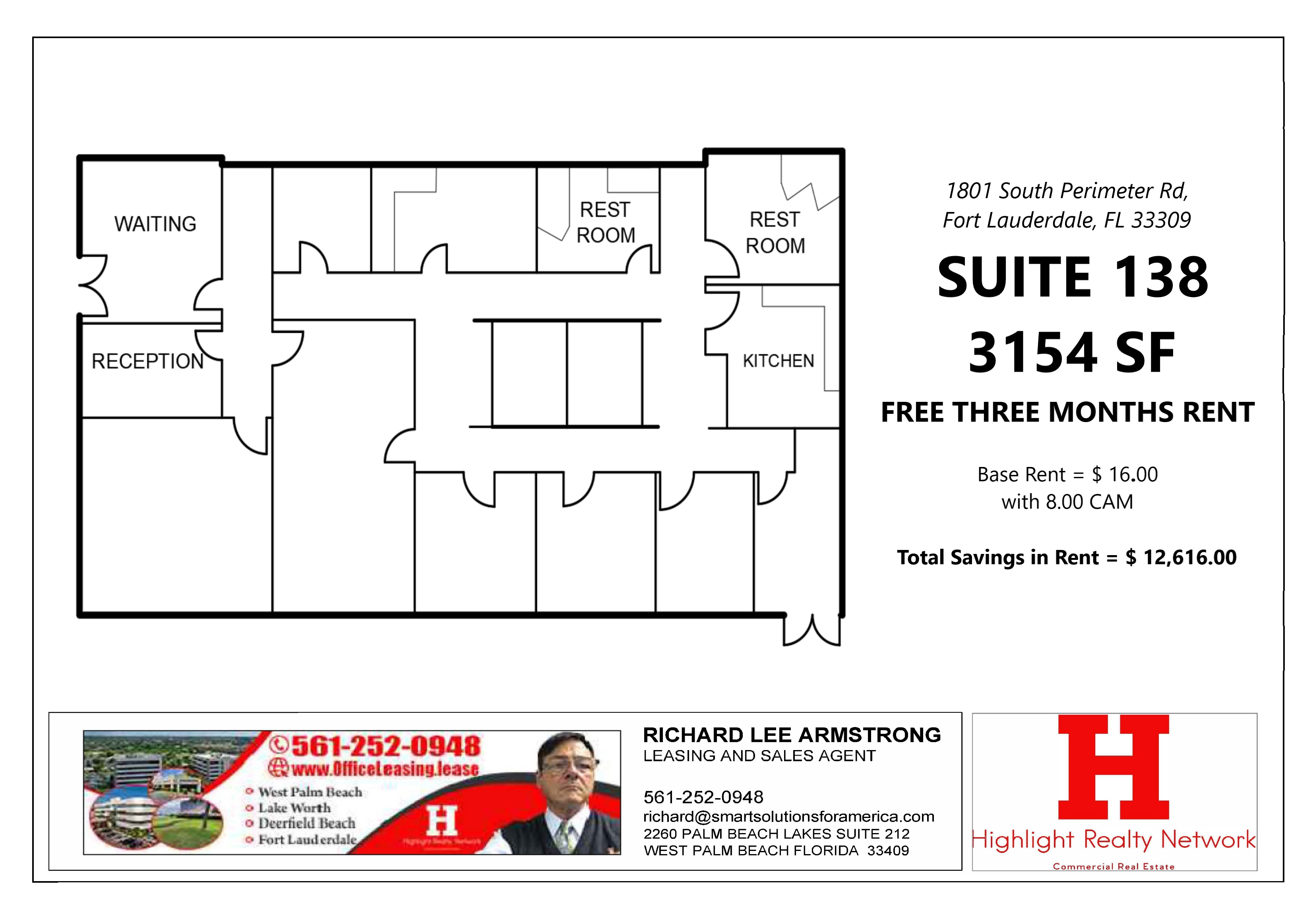 This 3154 SF Suite 138 Professional Medical and Office Space is at 1801 S Perimeter Rd, Fort Lauderdale, FL 33309. This workplace is suitable for shared office spaces and is spacious enough to keep you comfortable while you work. Contact us today to schedule a viewing! We are committed to providing exceptional service to our tenants and maintaining a safe and enjoyable working environment. If you have any questions or want to schedule a building tour, please contact us at [561-252-0948] or at [Highlightrealtynetworkrla@gmail.com]. We are excited to hear from you and may welcome you as a new tenant in our building. Thank you for considering us as your new Fort Lauderdale, FL home.