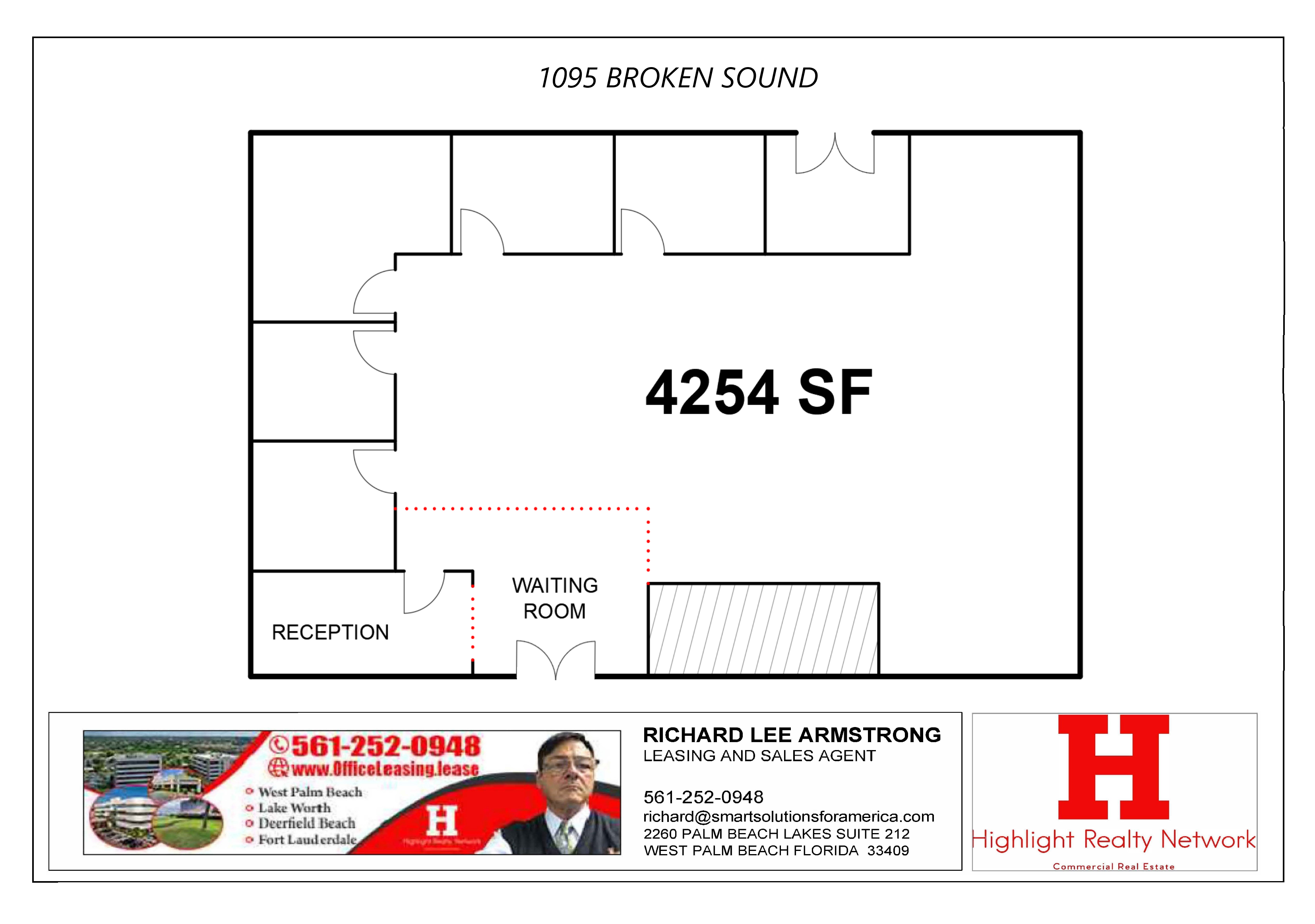 This 4254 SF Suite 100 Professional Office Space is at 1095 Broken Sound Pkwy., Boca Raton, FL 33487. We offer 3 FREE MONTHS of rent on the base rent, one per year. Visit now and make an appointment today. We are committed to providing exceptional service to our tenants and maintaining a safe and enjoyable working environment. If you have any questions or would like to schedule a building tour, please contact us at [561-252-0948] or email us at [Highlightrealtynetworkrla@gmail.com]. We are excited to hear from you and may welcome you as a new tenant in our building. Thank you for considering us as your new Boca Raton, FL home.
