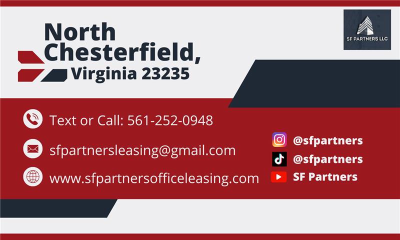 We have 5161 SF Suite 207 Professional Office Space in North Chesterfield, VA 23235. It includes 3 FREE MONTHS and rates that cover utilities, building services, and property expenses. Additionally, this workspace is spacious and comfortable, making it ideal for your business. Talk to us and book your viewing now! We are committed to providing exceptional service to our tenants and maintaining a safe, enjoyable work environment. If you have any questions or would like to schedule a building tour, please contact us at [561-252-0948] or email us at [sfpartnersleasing@gmail.com]. We are excited to hear from you and would welcome you as a new tenant in our building. Thank you for considering us as your new home in North Chesterfield, VA.